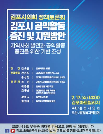 [한국연예축제일보, 허난세기자] 김포시의회가 ?김포시 공익활동 증진 및 지원 방안?을 찾기 위해 오는 2월 17일 오후2시 김포아트빌리지 다목적홀에서 정책토론회를 개최한다.