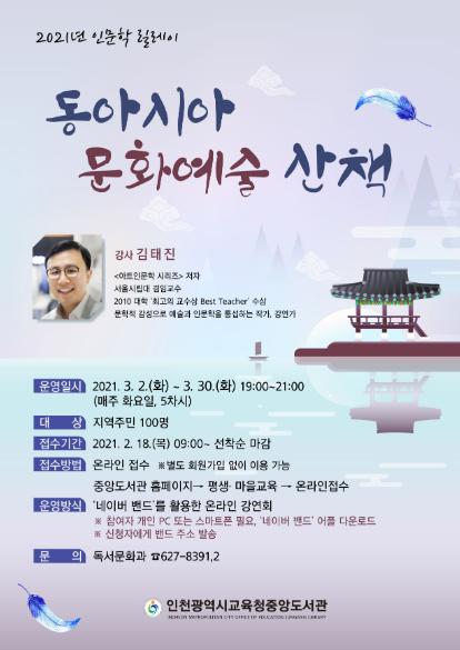 중앙도서관 관계자는 “인문학을 통해 동아시아 문화예술을 함께 나누며 코로나19로 지친 시민들에게 힐링의 시간이 되길 바란다”고 말했다.