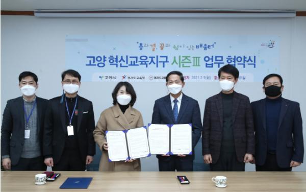 시는 지난 9일 시청 열린회의실에서 이재준 고양시장과 최승천 고양교육장이 참석한 가운데, 경기도교육청과 혁신교육지구 시즌Ⅲ 업무협약을 맺고 고양교육지원청과는 2021년 세부사업 운영을 위한 부속합의를 체결했다.