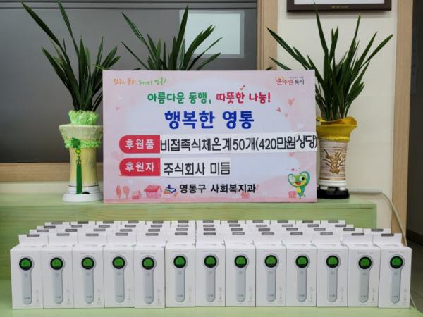 [한국연예축제일보, 유혜경기자] 수원시 영통구는 ㈜미듬(대표 이재민)에서 지난 9일 코로나19로 어려움을 겪고 있는 저소득가정 등을 위해 비접촉식 체온계 50개(420만원 상당)를 전달했다고 밝혔다.