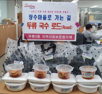 [한국연예축제일보, 유혜경기자] 대구 달서구 두류3동(동장 장석태), 지역사회보장협의체(위원장 남윤덕)는 관내 저소득어르신 20명에게 건강 장수먹거리인 국수 세트를 지원하는“장수마을로 가는 길, 두류 국수 로드(Road)”사업을 추진한다고 밝혔다.