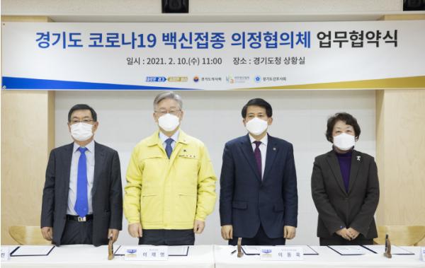 이재명 경기도지사는 10일 경기도청 상황실에서 이동욱 경기도의사회 회장, 정영진 경기도병원회 회장, 전화연 경기도간호사회 회장과 코로나19 백신접종 협력을 위한 ‘경기도 코로나19 백신접종 의정협의체 업무협약’을 체결했다.
