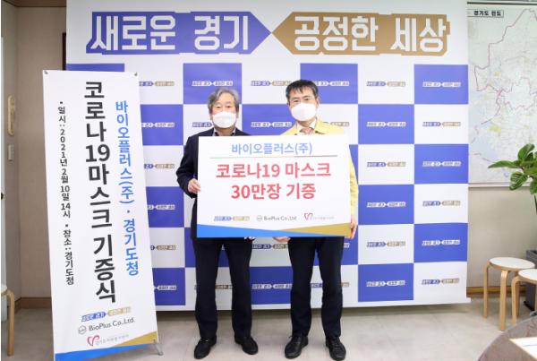 이 날 바이오플러스(주)는 6천만 원 상당의 덴탈마스크 30만 장을 경기도에 기증했다. 바이오플러스(주)는 2003년에 설립한 직원 수 50여 명의 중소기업으로 필러(filler)·유착방지제 등의 의료기기와 화장품, 마스크 등을 생산하고 있다.