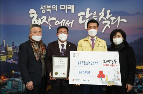 [한국연예축제일보, 유혜경기자] 서울 성북구 청소년지도협의회가 지난 9일 ‘2021 희망온돌 따뜻한 겨울나기’ 성금 200만원을 구에 전달했다. 이번 후원 성금은 코로나 19로 힘든 시기, 관내 어려운 가정의 모범 청소년들에게 작은 희망을 주고자 위원들이 십시일반 나눔의 손길을 모아 마련됐다.