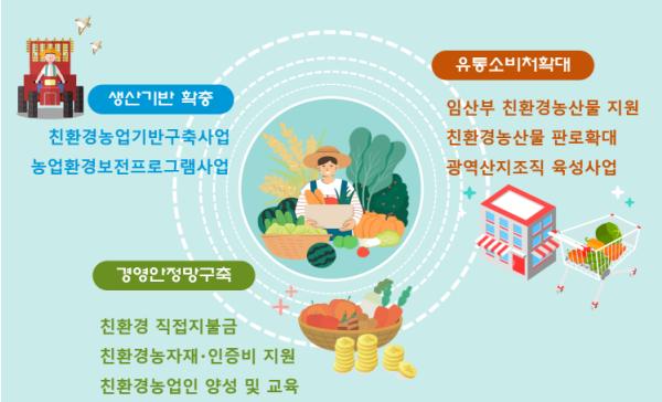 소비·유통 측면에서는 국민건강증진 및 친환경농산물 저변확대를 위한 임산부 친환경농산물 지원사업에 16억 원, 비대면판로 개척 등 친환경농산물의 공급을 견인할 수 있는 다양한 수요견인책 마련에 17억 원을 투자한다. 특히 생산부터 소비까지 이어지는 선순환체계 구축의 핵심이 될 광역단위산지조직 육성에 집중할 계획이다.