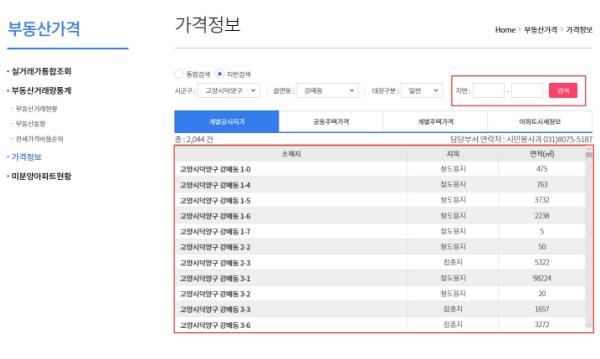 새로운 가격정보 서비스는 특정 지역의 부동산 가격만 궁금하거나, 원하는 지역의 정확한 주소를 모를 경우 유용하다. 경기부동산포털의 ‘부동산가격>>가격정보’에서 시군구와 읍면동만 선택하면 읍면동 전체 부동산의 개별공시지가, 주택가격, 아파트시세정보 등을 검색이 가능하다. 주변시세 파악에도 도움이 된다.