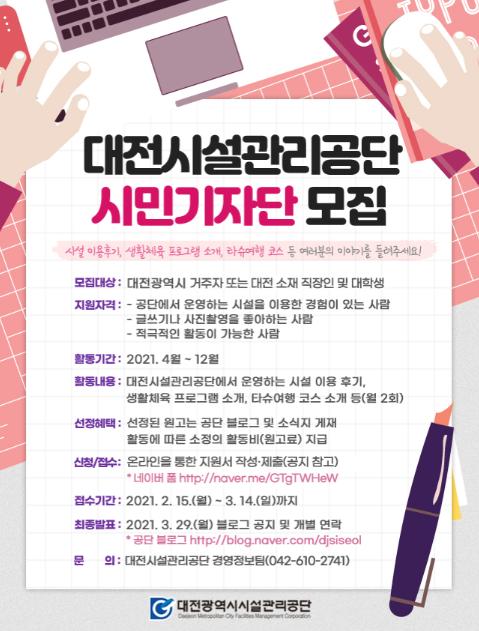공단 시민기자단은 대전광역시 거주자 또는 대전 소재 직장인 및 대학생이라면 누구나 응모 가능하며, 모집기간은 2월 15일부터 3월 14일까지이다.