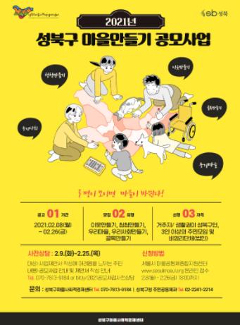 「2021년 성북구 마을만들기 공모 사업」은 오는 2월 26일(금)까지 서울시 마을공동체 종합지원센터 홈페이지에서 온라인으로 신청하면 된다. 자세한 사항은 성북구청 홈페이지를 통해 확인할 수 있다.