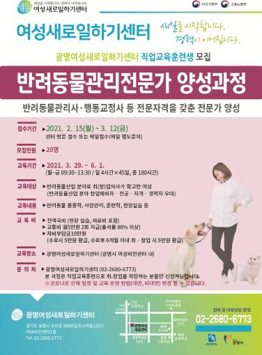 [한국연예축제일보, 유혜경기자] 광명여성새로일하기센터는 15일부터 3월 12일까지 직업교육훈련 ‘반려동물관리전문가 양성과정’ 참여자 20명을 모집한다.