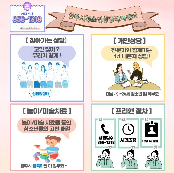 상담을 원하는 청소년들은 양주시청소년상담복지센터에문의하면 된다.