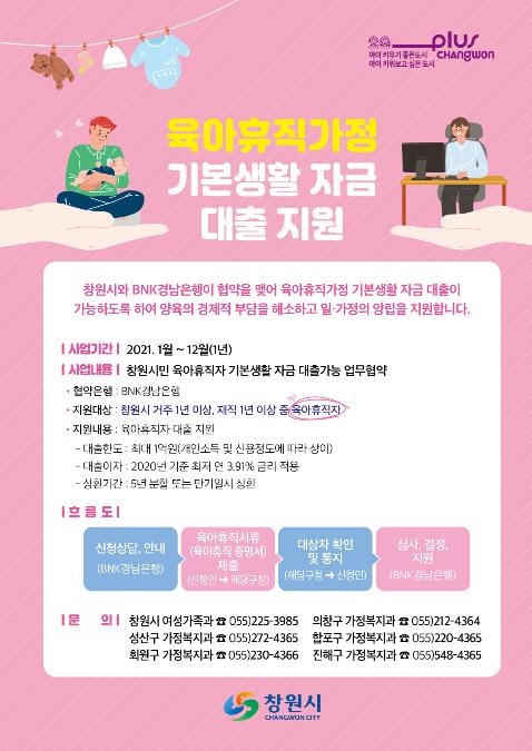 육아휴직가정 대출지원사업 대상은 창원시에 1년 이상 살면서 재직 1년 이상인 육아휴직가정으로 개인신용도에 따라 최대 1억원까지 대출을 해준다. 신청은 1월 1일부터 12월 31일까지 가능하다.