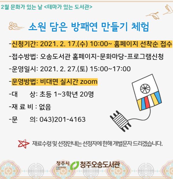 [한국연예축제일보, 유혜경기자] 청주오송도서관이 ‘문화가 있는 날’행사의 일환으로 27일 오후 3시부터 5시까지 ‘소원 담은 방패연 만들기’체험을 운영한다.