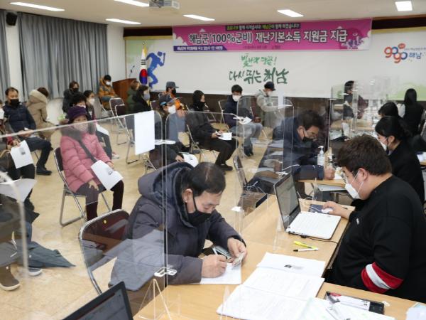 해남군은 코로나19 극복과 지역경제활성화를 위해 지난 1월 총 3만 5241세대, 6만 6,669명에게 1인당 10만원씩 재난기본소득을 지급했다.