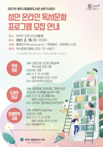 [한국연예축제일보, 이순례기자] 원주시립중앙도서관은 지역사회 독서문화 환경 조성을 통한 평생학습 도시 원주를 만들기 위해 2021년 상반기 성인 온라인 독서문화 프로그램을 운영한다.