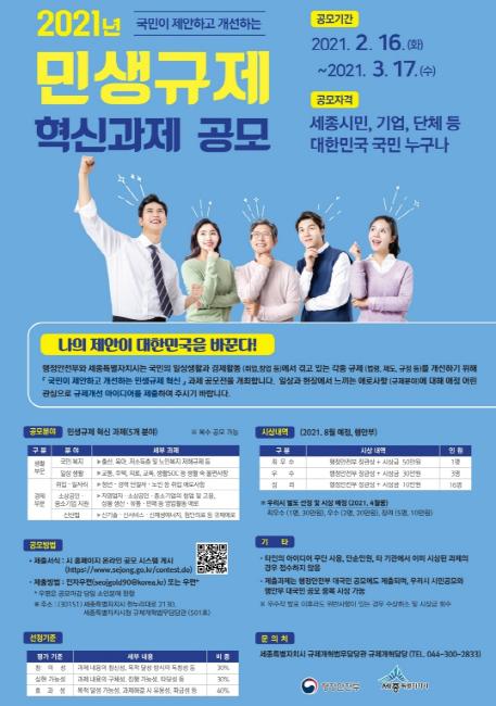 [한국연예축제일보, 유혜경기자] 세종특별자치시가 국민들이 일상생활과 경제활동에서 느끼는 불합리한 규제를 발굴·개선하기 위해 행정안전부와 ‘국민이 제안하고 개선하는 민생규제 혁신과제’공모전을 개최한다.
