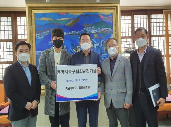 지난 2월 10일 중원대 이세인 감독과 라베르호텔 노성진 대표가 함께 통영시장실을 찾아 통영시와 통영시축구협회의 배려에 감사한다며 강석주 통영시장에게 축구협회 발전기금을 전하고 그 자리에서 통영시축구협회 정국식 회장에게 전달됐다.