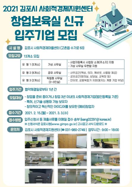 [한국연예축제일보, 안성경기자] 김포시는 우수한 기술력 ·창의적 아이디어를 보유한 (예비)창업자와 초기 창업 기업을 대상으로 2021 김포시 사회적경제지원센터 내 창업보육실 입주자를 모집 한다고 밝혔다.