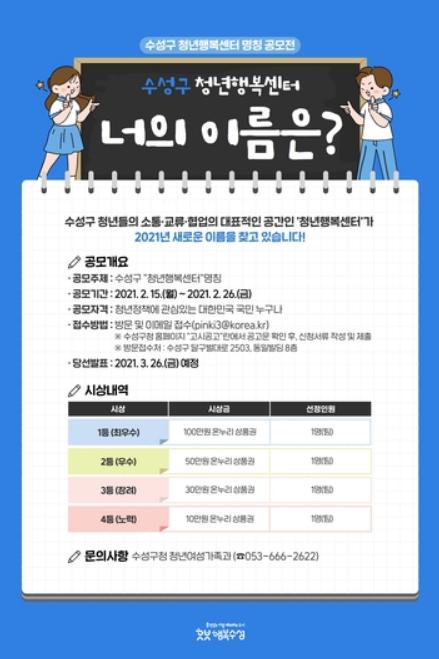 이번 명칭공모전은 수성구 청년정책에 관심 있는 사람이면 누구나 응모할 수 있으며, 1인당 1건씩 제출할 수 있다. 대상은 100만원, 최우수 50만원, 우수상 30만원, 노력상 10만원의 상금이 온누리상품권으로 지급된다.