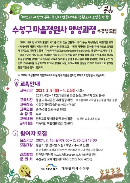 [한국연예축제일보, 유혜경기자] 대구 수성구는 오는 15일부터 26일까지 마을정원사 양성교육에 참여할 수강생을 모집한다.