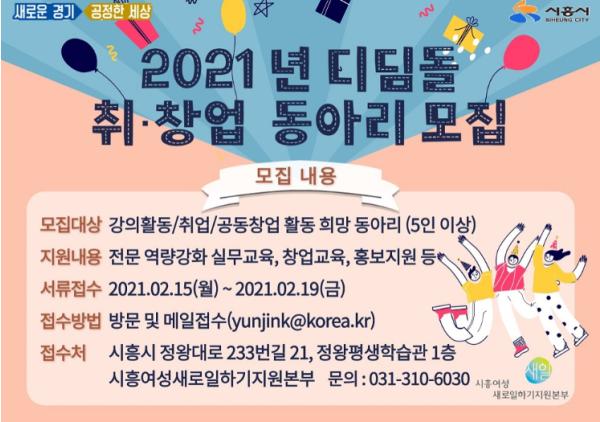 [한국연예축제일보, 안성경기자] 시흥시 일자리총괄과 여성새로일하기지원본부는 경력단절여성의 취·창업 전문성 강화 및 경력개발 지원을 위해 ‘2021년 디딤돌 취업지원사업’ 에 참여할 학습 동아리를 공개 모집한다.