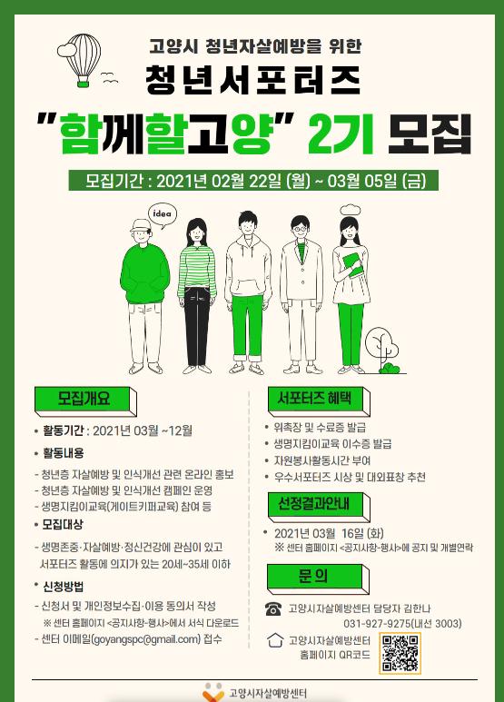 [한국연예축제일보, 유혜경기자] 고양시 자살예방센터는 청년층 자살예방을 지원할 청년 서포터즈 ‘함께할고양’ 2기를 오는 22일부터 3월 5일까지 모집한다.