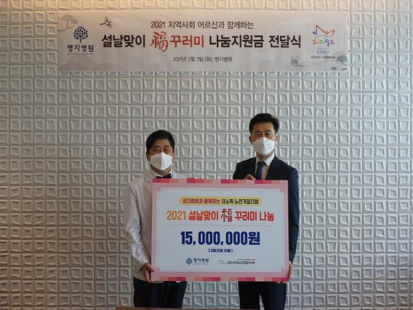 매년 설 명절 때면 명지병원 직원과 가족들이 한자리에 모여 복꾸러미를 만들고 어르신들을 직접 찾아뵙고 전달까지 하였으나, 올해는 코로나19 감염 예방을 위해 복지관 직원들이 200명의 어르신 가정을 방문해 복꾸러미를 전달했다.