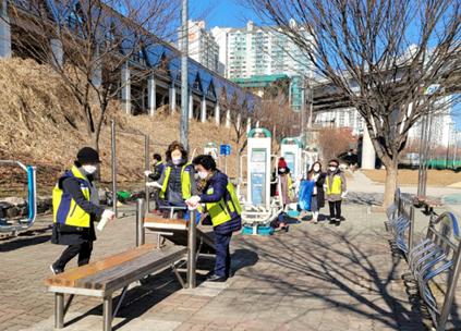 소독은 3인 1조로 구성하여 구민들의 통행과 이용이 잦은 응봉역 인근의 엘리베이터와 버스정류소 등 공용시설물과 공원 및 개방화장실을 집중적으로 방역했다.