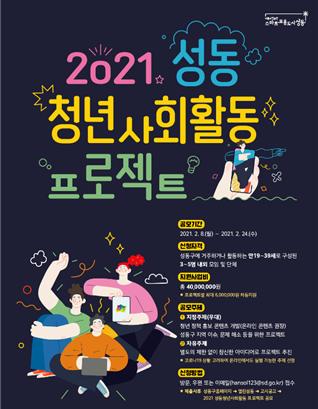 [한국연예축제일보, 유혜경기자] 서울 성동구는 이달 8일부터 24일까지 ‘2021년 청년사회활동프로젝트’에 참여할 청년을 모집한다고 밝혔다.
