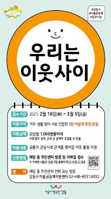 [한국연예축제일보, 유혜경기자] 강동구가 주민 주도의 마을공동체 활성화를 위해 '2021 이웃만들기 지원사업’을 추진한다.