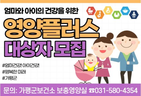 [한국연예축제일보, 황해식기자] 가평군보건소는 임산부와 영유아의 건강을 위한 영양플러스 사업 신규대상자를 모집한다고 밝혔다.