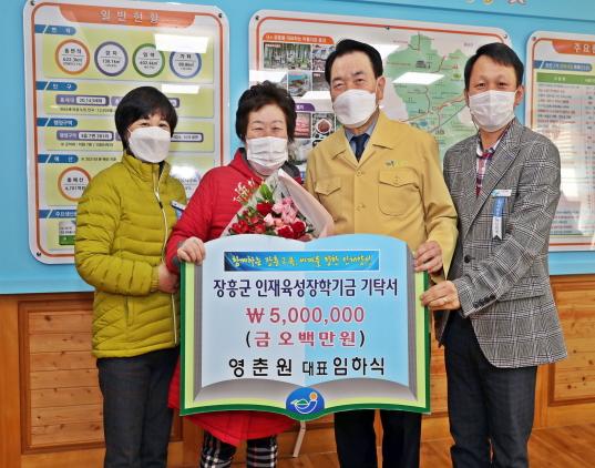 정종순 장흥군수는 “코로나19로 인한 불경기 속에서도 이웃돕기와 장흥 교육의 100년 대계를 위해 아름다운 기탁이 이어지고 있다”며 “학생들을 위해 장학기금을 소중하게 사용하겠다”고 감사의 말씀을 전했다.