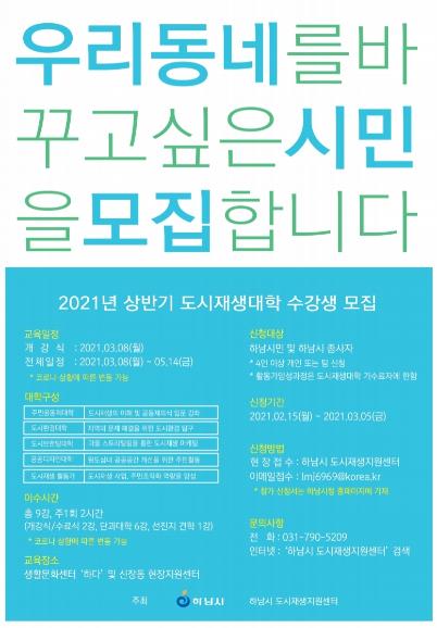 [한국연예축제일보, 유혜경기자] 하남시는 상반기 도시재생대학 수강생을 오는 3월 5일까지 모집한다고 밝혔다.