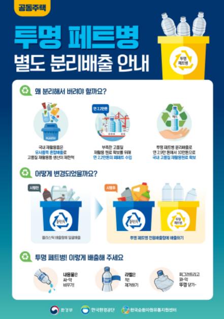환경부의 ‘재활용가능자원의 분리수거 등에 관한 지침’ 개정에 따라 지난해 12월 25일부터 공동주택에서는 투명페트병을 별도 배출해야 한다.