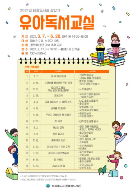 대면 운영의 경우 태장도서관 1층 체험동화관에서, 비대면 운영 시에는 온라인 화상회의 플랫폼(ZOOM)을 활용해 진행할 계획이다.