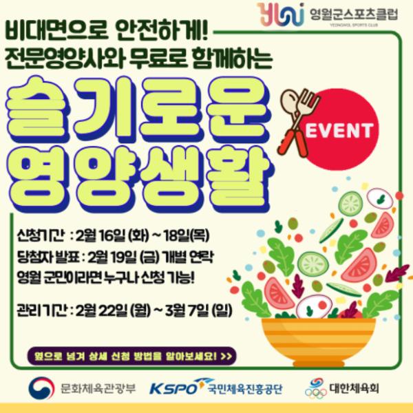 [한국연예축제일보, 한진우기자] 영월군스포츠클럽이 코로나19 사태의 장기화로 체육시설의 운영 제한 및 폐쇄로 인한 군민 체육 활동 저조로 약화된 군민 체력증진을 위해 식습관 개선을 통해 군민의 체력증진과 건강 유지에 도움을 주고자 전문 영양사와 협력을 통해 비대면 식습관 관리 이벤트를 진행한다.