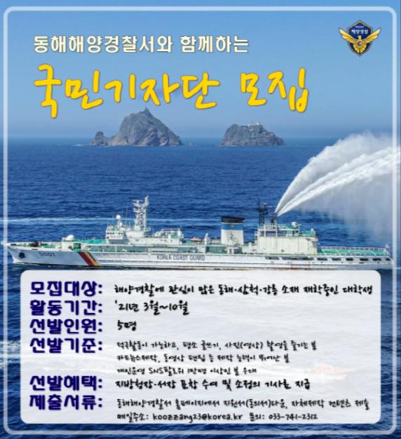 [한국연예축제일보, 김채영기자] 동해해양경찰서는 해양경찰의 온라인 소통 활성화와 정책 홍보활동을 위해 앞장설 동해·삼척·강릉 소재의 대학생 국민 기자단을 오는 26일까지 모집한다고 밝혔다.