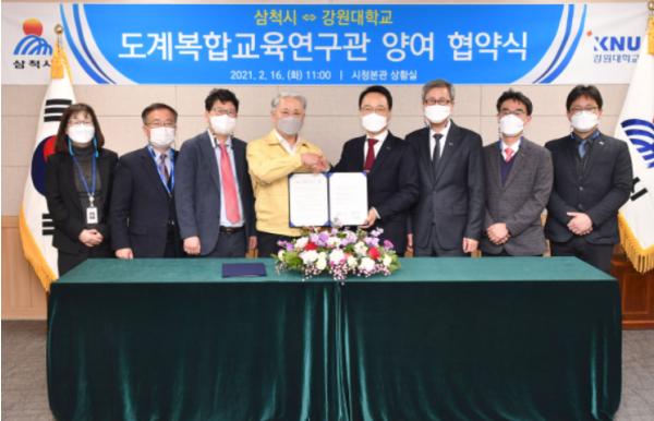 삼척시와 강원대학교는 도계 대학도시 조성의 첫 번째 사업으로 2월 16일 오전 11시, 시청 상황실에서 ‘도계 복합교육연구관 양여 협약식’을 개최했다.