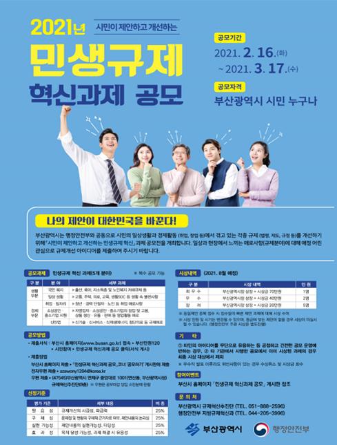 [한국연예축제일보, 유혜경기자] 부산시는 2월 16일부터 3월 17일까지(30일간) 행정안전부와 공동으로 일상생활과 경제활동에 직결된 현장규제 애로사항을 발굴 ? 개선하기 위한 ‘민생규제 혁신 과제 대시민 공모’를 추진한다고 밝혔다.