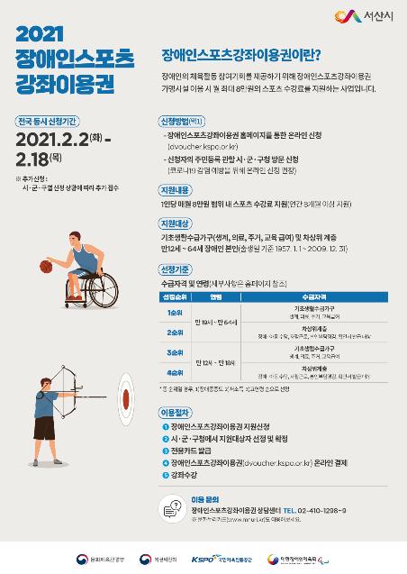 [한국연예축제일보, 김상호기자] 서산시가 저소득층 장애인의 스포츠시설 이용지원을 위한 ?년 장애인스포츠강좌이용권’신청을 오는 18일까지 접수한다.
