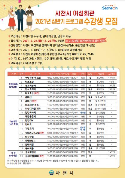 사천시 여성회관은 2월 22일 오전 9시부터 사천시 여성회관 홈페이지를 통해 선착순으로 '2021년 상반기 프로그램’수강 신청을 받는다.