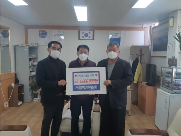 거류면발전위원회(위원장 황영주)는 2월 15일 거류면사무소를 방문하여 어려운 이웃을 돕기 위해 회원들이 십시일반으로 모은 성금 100만 원을 기탁했다.