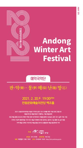 [한국연예축제일보, 이순례기자] '2021안동윈터아트페스티벌 AWAF(Andong Winter Art Festival)’의 세 번째 공연 ‘예악국악단, 판·악(樂) - 몽(夢)매(寐)난(難)망(忘)’이 오는 20일 오후 7시 안동문화예술의전당 백조홀에서 진행된다.