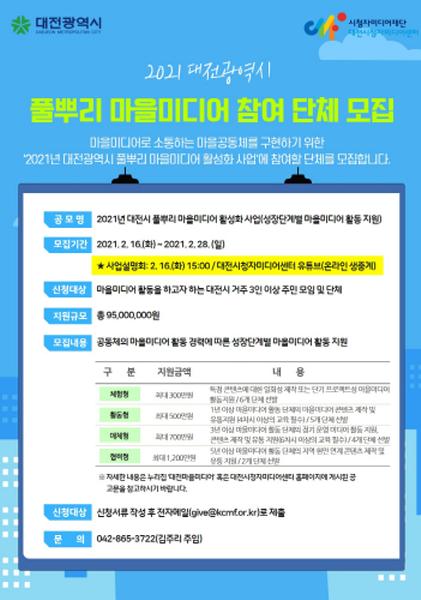 [한국연예축제일보, 유혜경기자] 대전시는 2월 16일부터 28일까지 ‘2021년 대전광역시 풀뿌리 마을미디어 활성화 사업’에 참여할 단체를 모집한다고 16일 밝혔다.