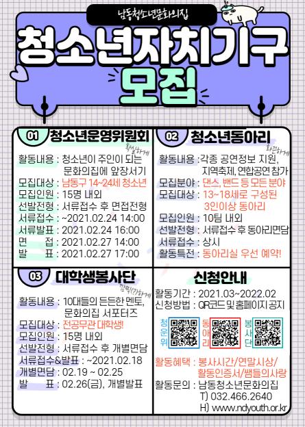 남동 청소년 문화의 집 홈페이지 공지사항에 있는 신청링크나 포스터의 QR코드를 스캔해 신청서를 내려 받아 작성·제출하면 된다.