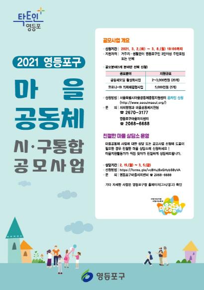 채현일 영등포구청장은 “주민들이 직접 나서서 마을 내 관심거리, 이야깃거리, 고민거리 등을 찾고 해결해보는 경험을 통해 진정한 주민 주도의 마을공동체를 조성할 수 있을 것”이라며, “함께 머리를 맞대고 힘을 합쳐 살기 좋은 마을을 만들어가는 일에 구민들의 많은 관심과 참여를 부탁드린다”고 전했다.