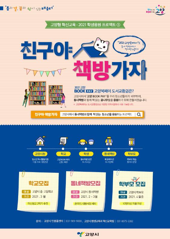 한편, 고양시는 학교·마을과 유기적으로 협력해 건강한 교육기반을 구축하는 고양형 혁신교육 사업을 추진하고 있다. 올해‘친구야 책방가자’프로젝트 이외에도 학교에 자율체험버스와 민간 교육 프로그램을 지원하는 온마을 행복학교 프로그램, 학교 공간을 미래형 교육공간으로 리모델링하는 학교 공간혁신 프로젝트 등을 추진할 방침이다.