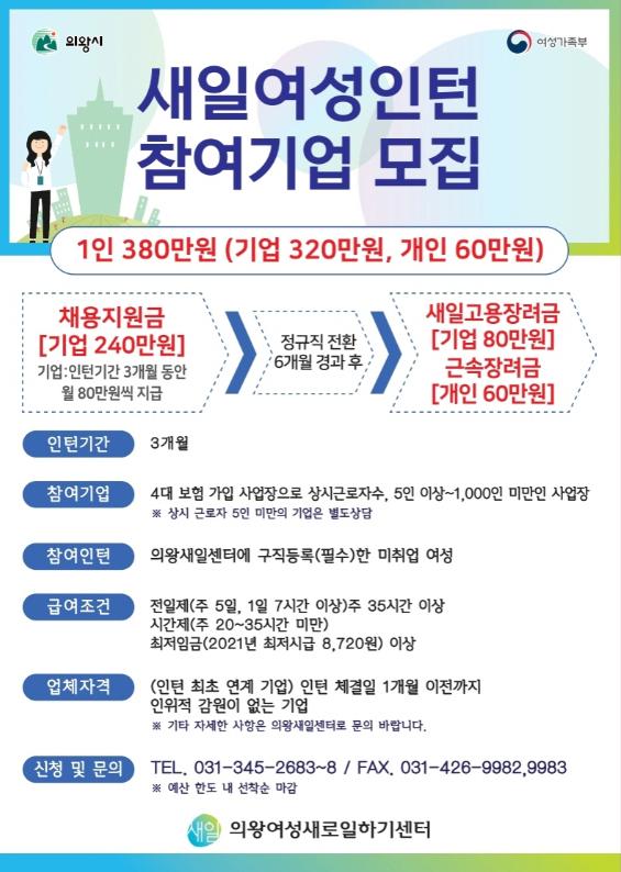 [한국연예축제일보, 안성경기자] 의왕시는 여성의 빠른 취업과 안정적인 근무를 돕기 위한‘새일여성인턴’참여기업을 모집한다고 16일 밝혔다.