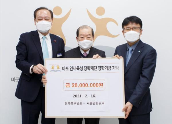 16일(화) 오전, 마포인재육성장학재단 사무국에서 열린 서울화력발전소 장학금 기탁식에 유동균 마포구청장이 함께했다. 이날 서울화력발전소는 마포의 인재양성을 위한 장학금 2000만원을 기탁했다.