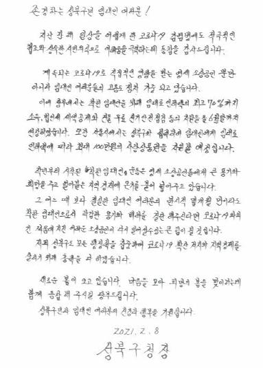 한편 성북구는 착한 임대인 운동 확산을 위해 관내 현수막 게시, 모범사례 홍보, 플랫폼 홍보 등으로 지역 내 자발적 임대료 인하를 유도하기도 했다. 이승로 성북구청장도 설 연휴 전, 후 친필 서한문을 작성해 관내 임대인에게 발송한 바 있다.