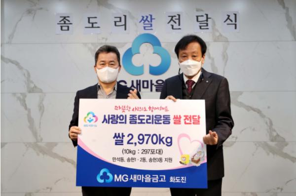 [한국연예축제일보, 유혜경기자] 인천광역시 동구는 화도진새마을금고에서 설 명절을 앞둔 지난 8일 어려운 이웃돕기를 위한“사랑의 좀도리 쌀 모으기 운동“으로 송현1·2동, 송현3동과 만석동에 쌀 2,970㎏(297포)을 전달했다고 밝혔다.
